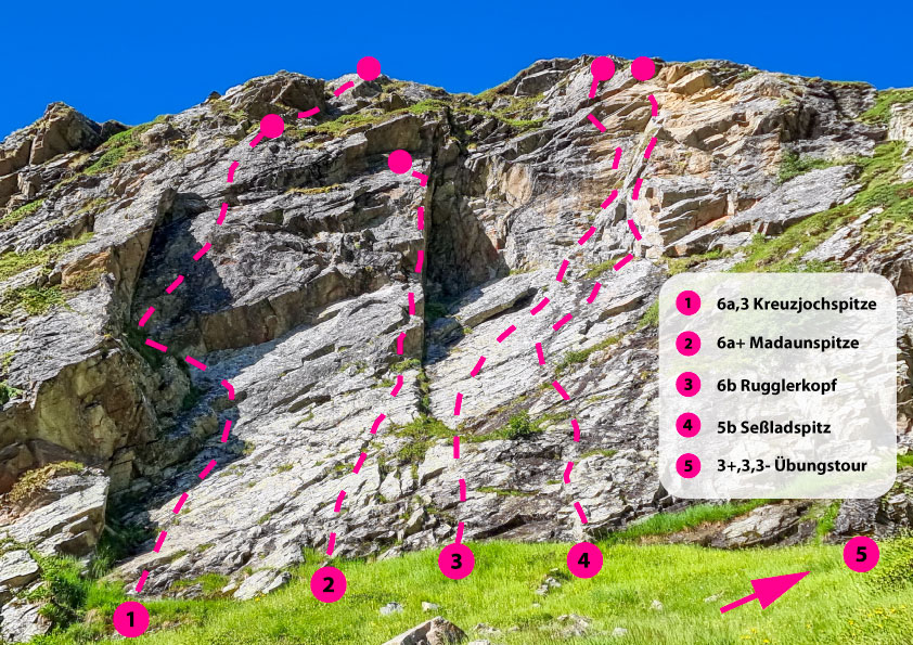 The Niederelbehütte climbing garden in the Paznaun Valley is perfect for climbers of all levels. The family-friendly Märchenwiese sector offers well-secured, easy routes for beginners and children, ideal for first climbing experiences. For advanced climbers, the Kreuzjochblick sector offers more challenging routes. Both areas are beautifully situated in alpine nature and are easily accessible, so that both families and experienced climbers get their money's worth.