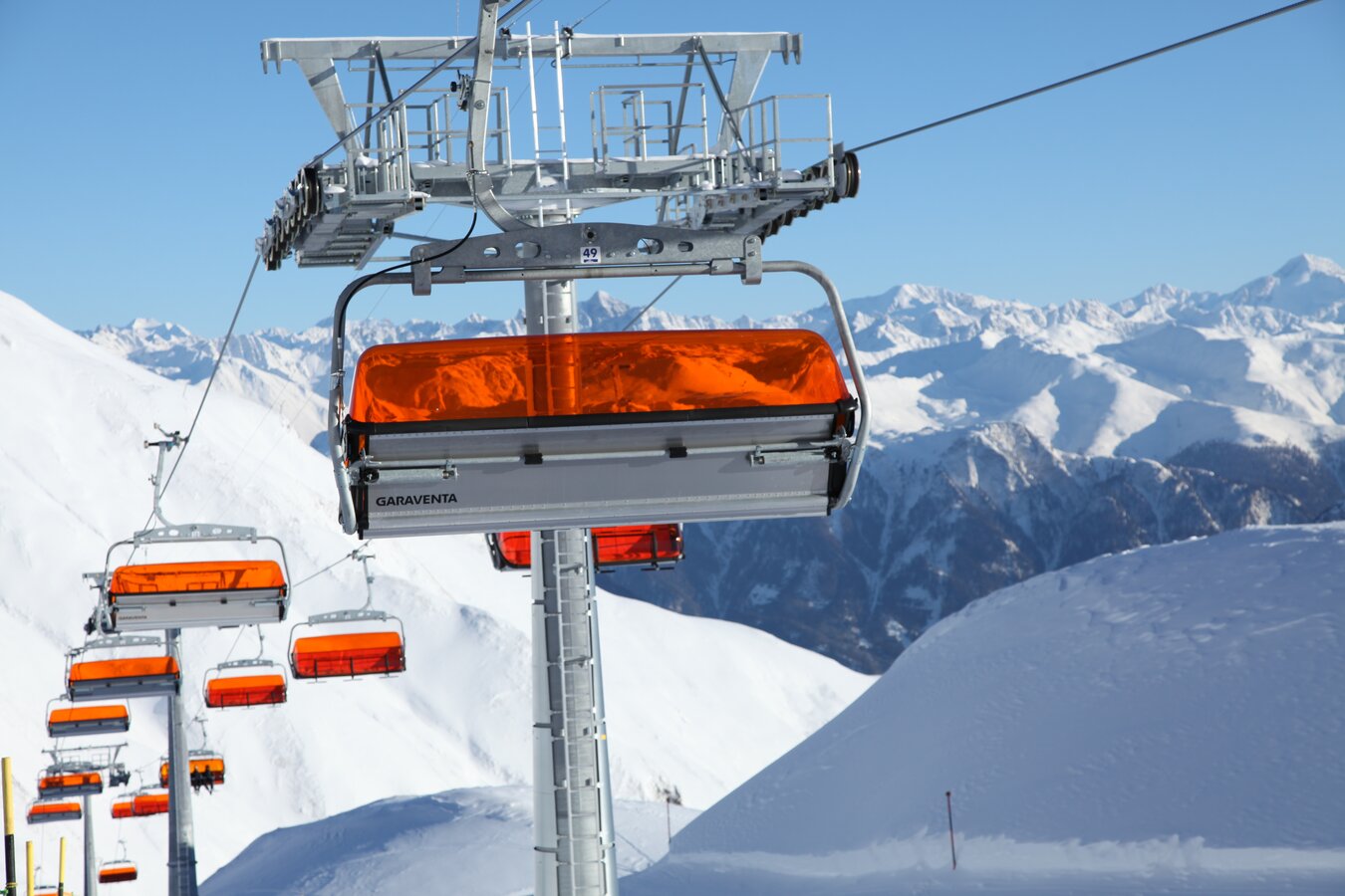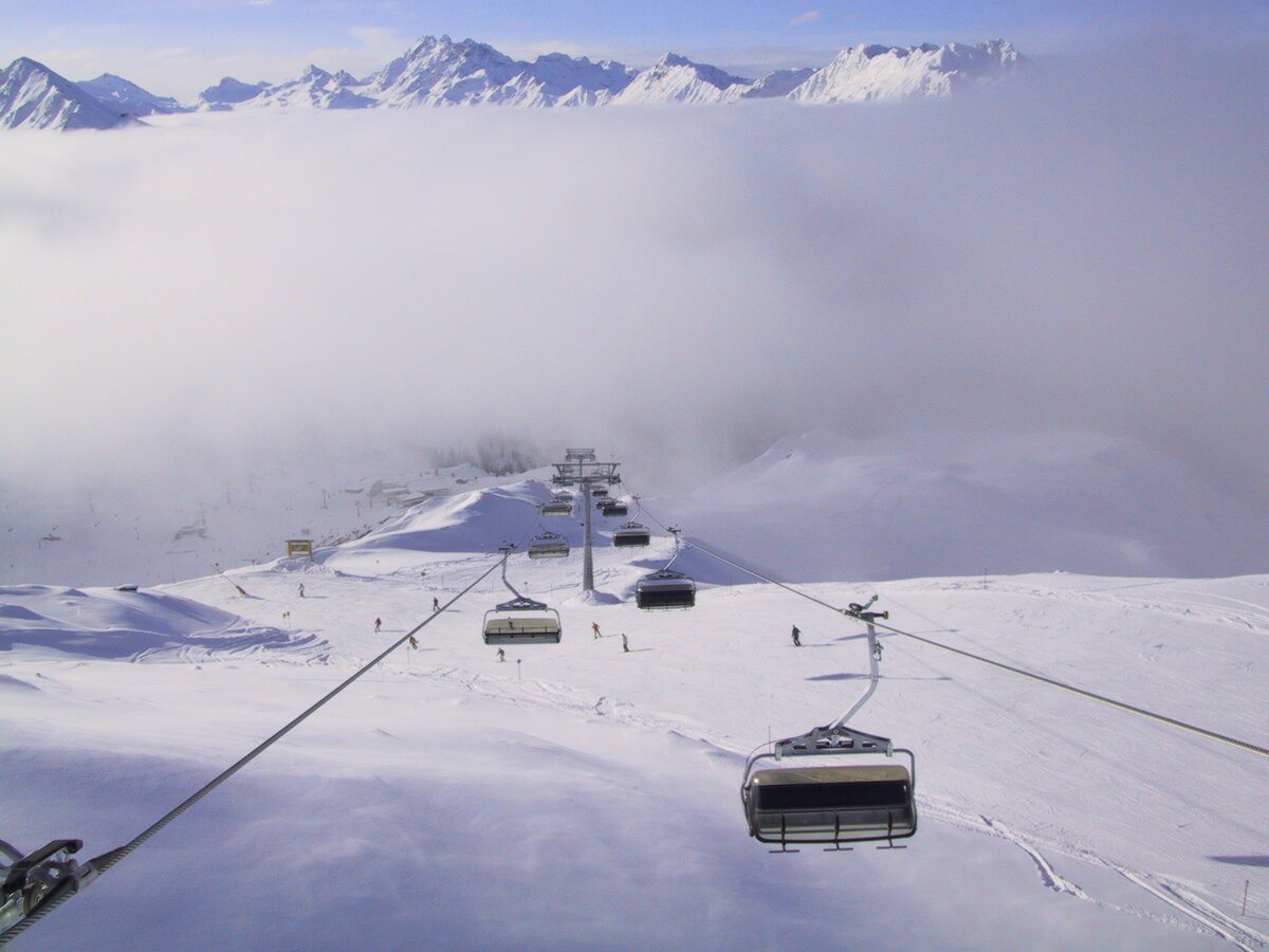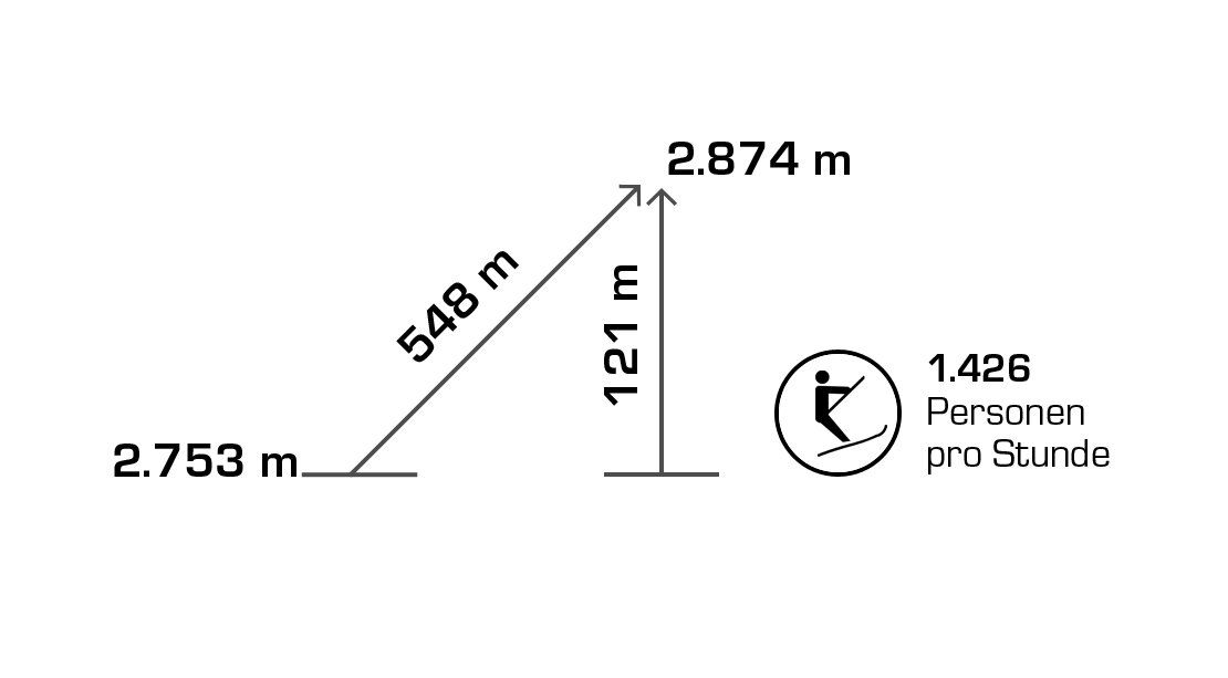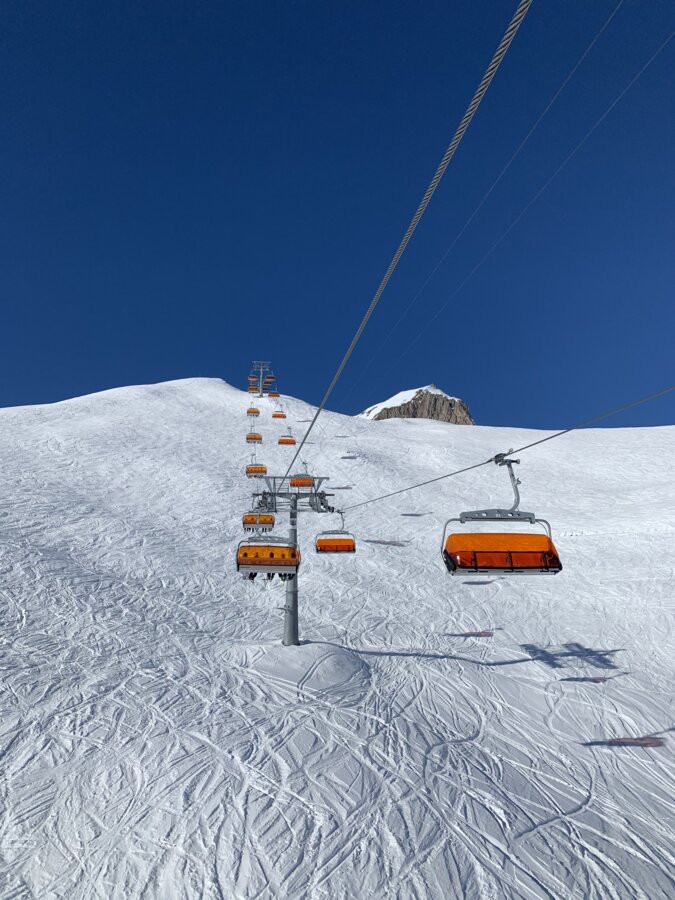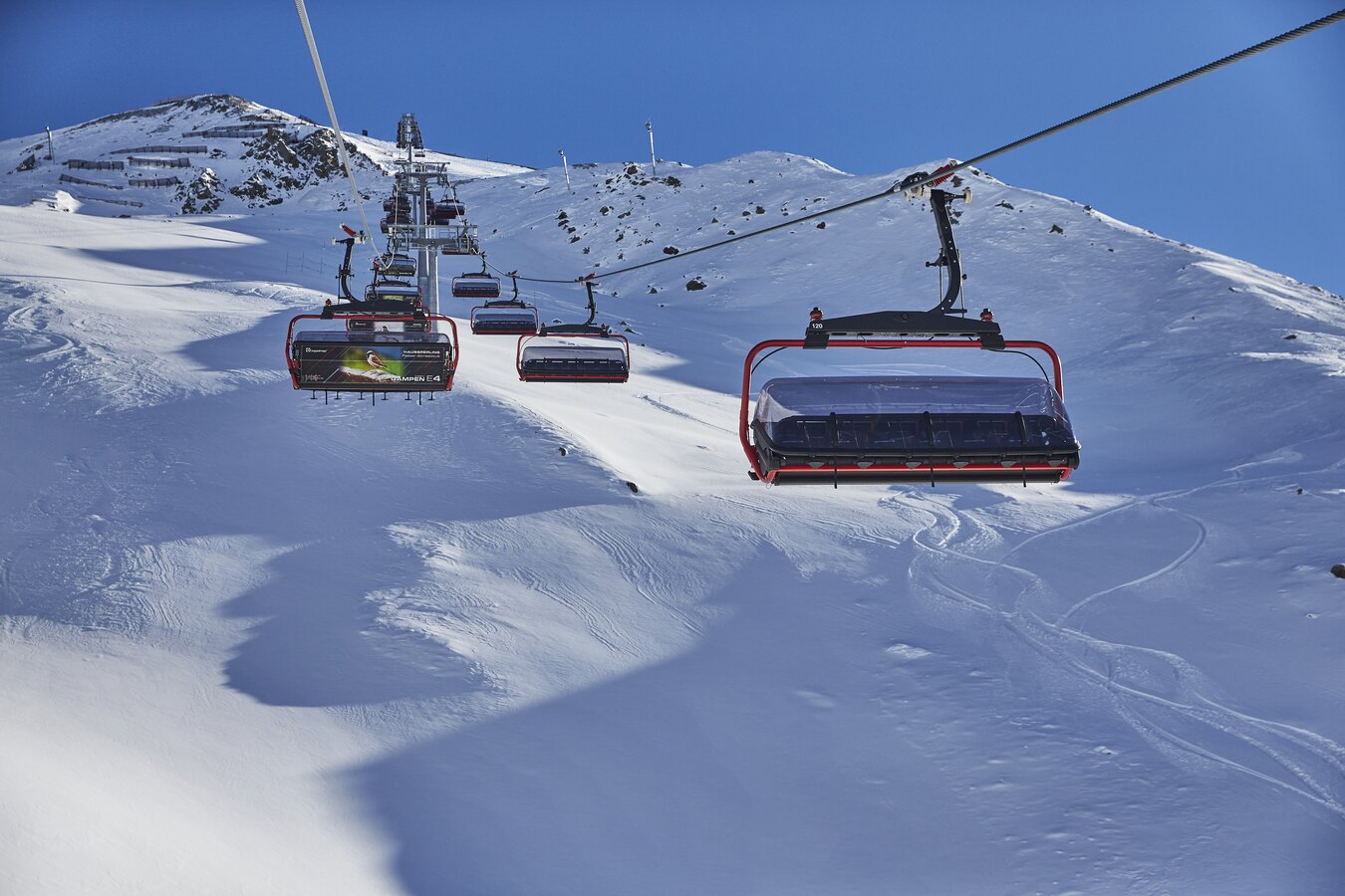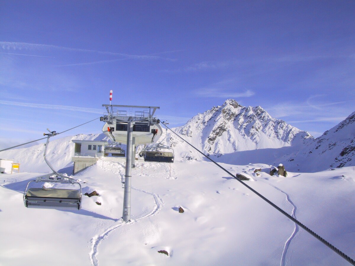 Built in 2000, the detachable chair lift has weather protection bubbles, a total capacity of 2.800 persons per hour and 60 six-person chairs, which travel 1.050 m over 10 pillars up to the mountain station.