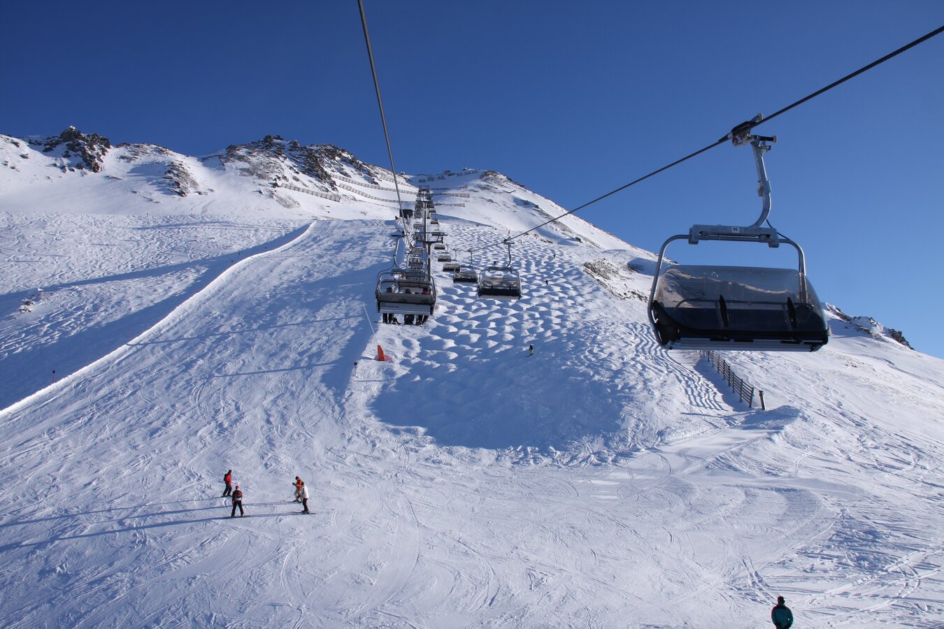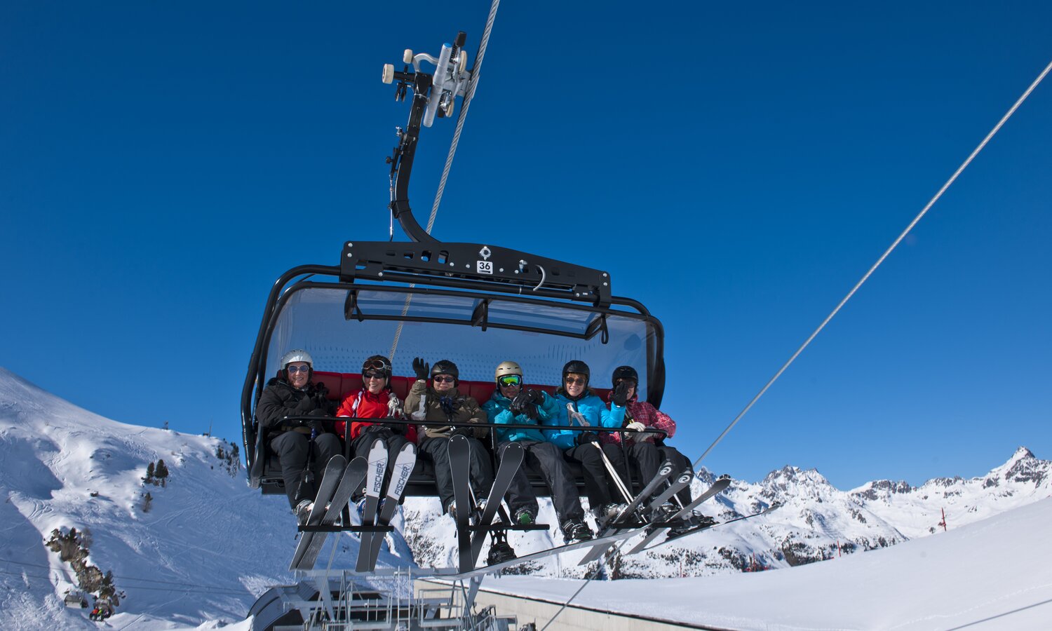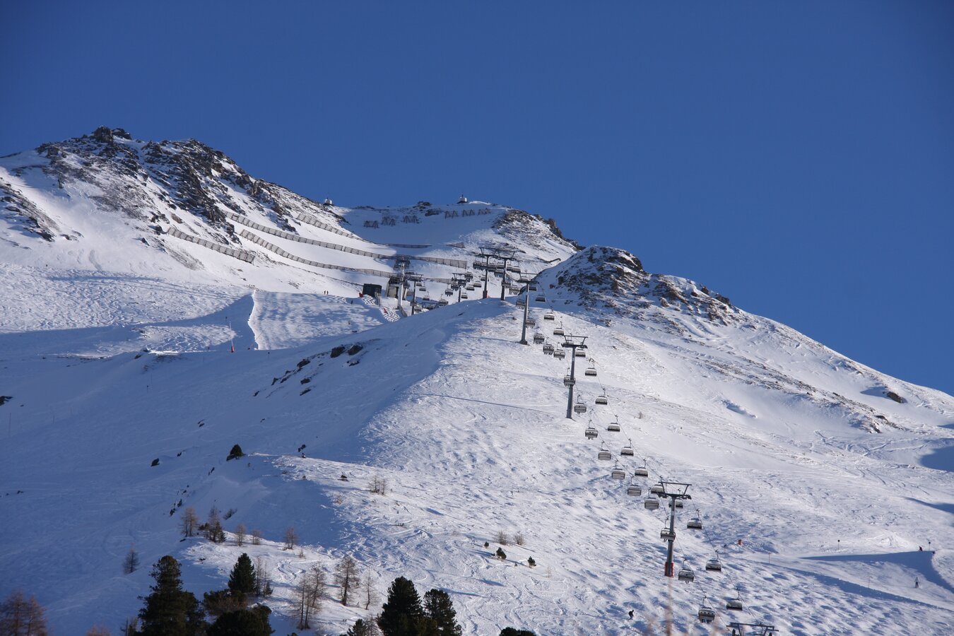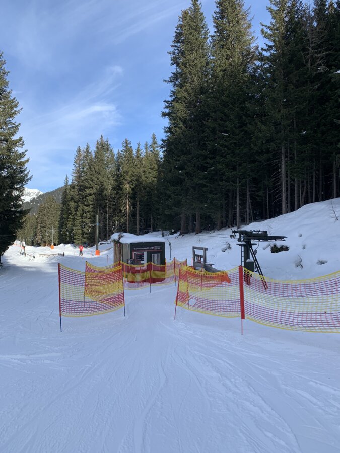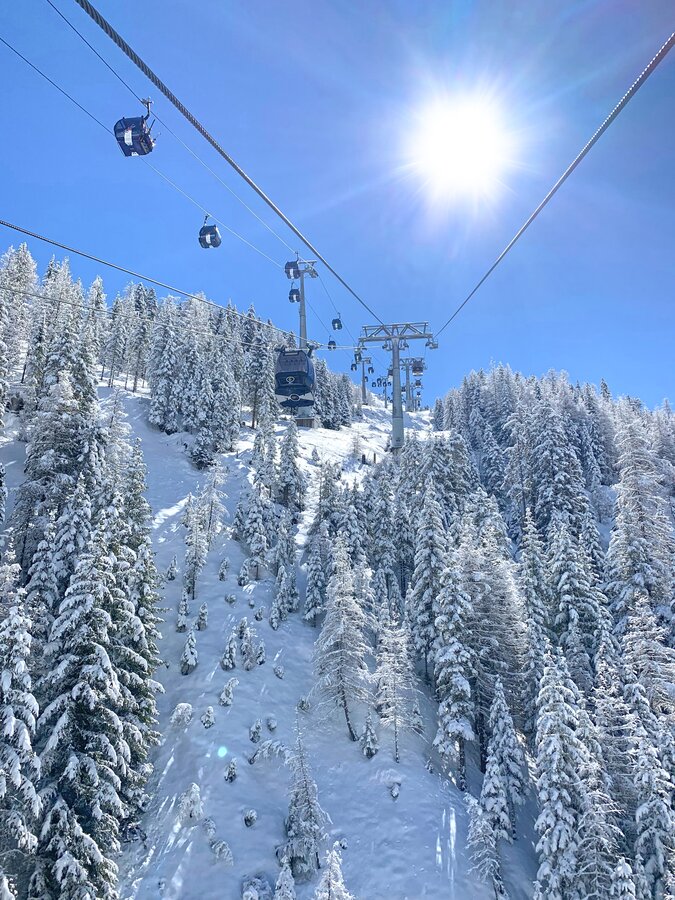 Built in 2000, the detachable chair lift has weather protection bubbles, a total capacity of 2.800 persons per hour and 60 six-person chairs, which travel 1.050 m over 10 pillars up to the mountain station.
