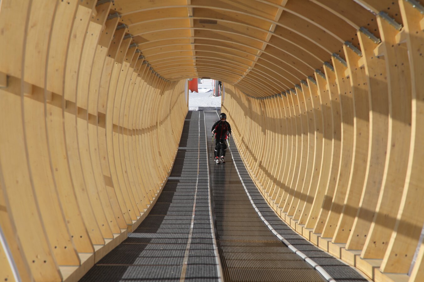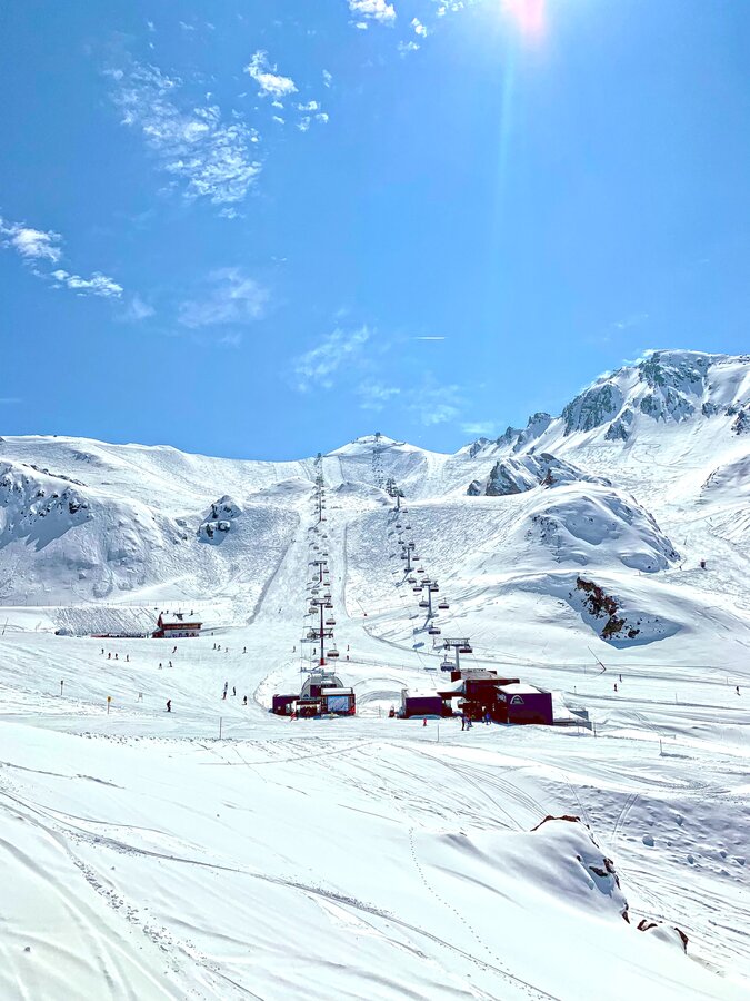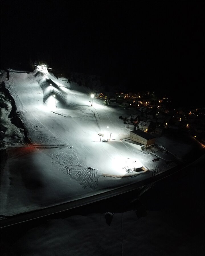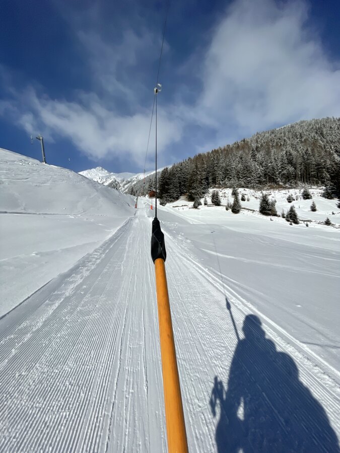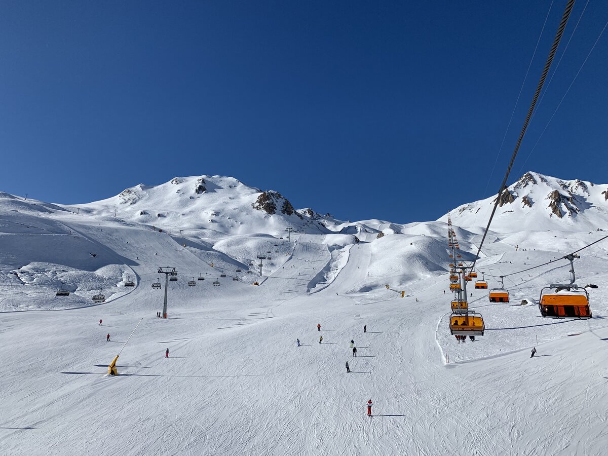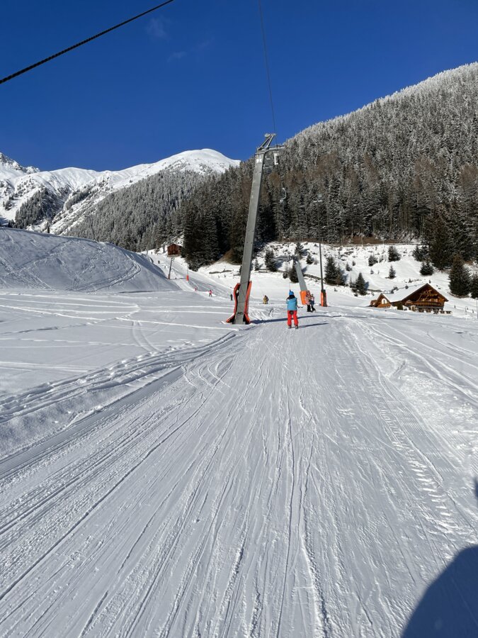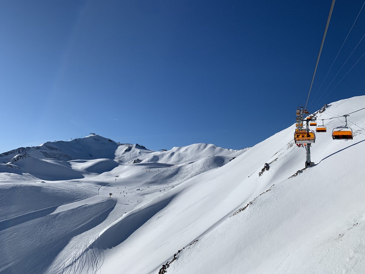 Built in 2000, the detachable chair lift has weather protection bubbles, a total capacity of 2.800 persons per hour and 60 six-person chairs, which travel 1.050 m over 10 pillars up to the mountain station.