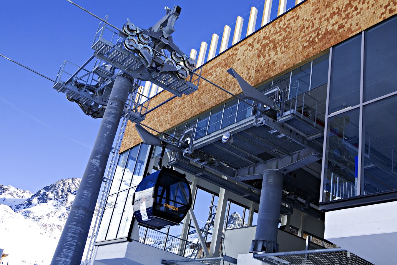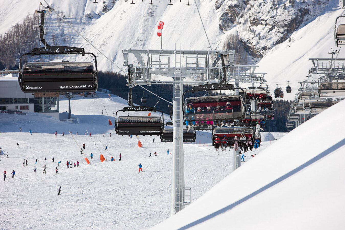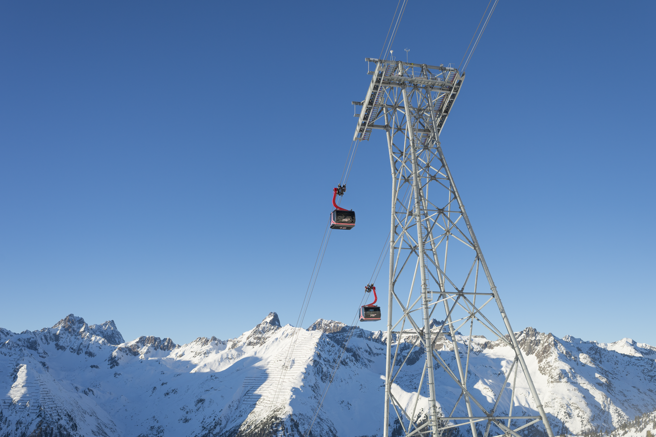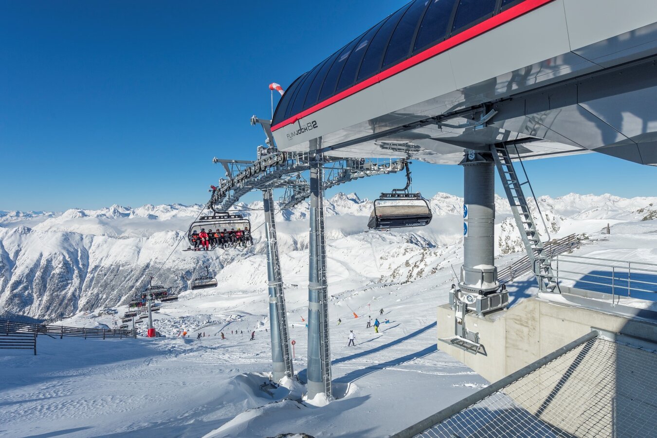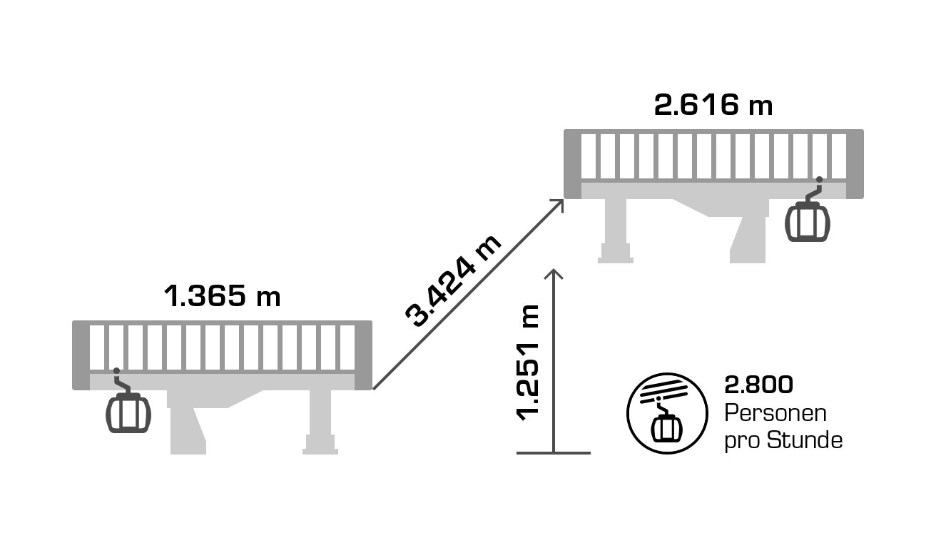 Its 24-passenger bicable ropeway design (funitel system) facilitates safe operation even at wind speeds of 100 km/h. 63 gondolas run from Ischgl to Idalp with a maximum line speed of up to 6 m/s.