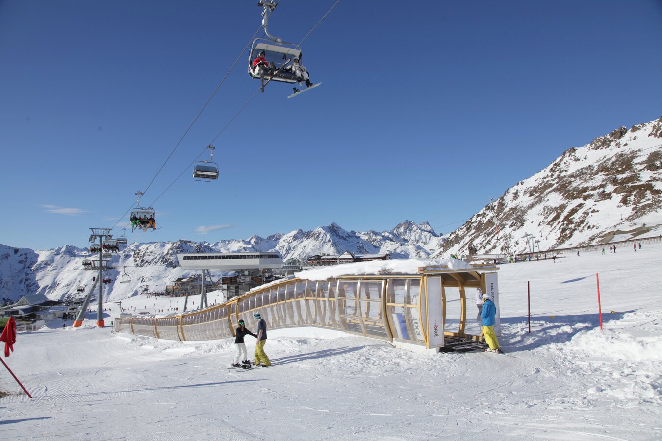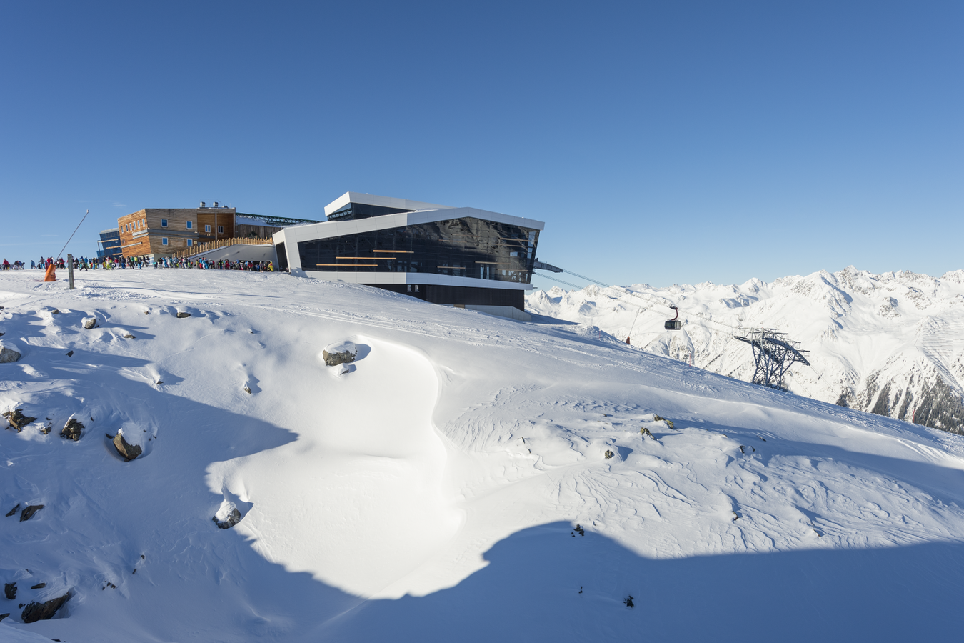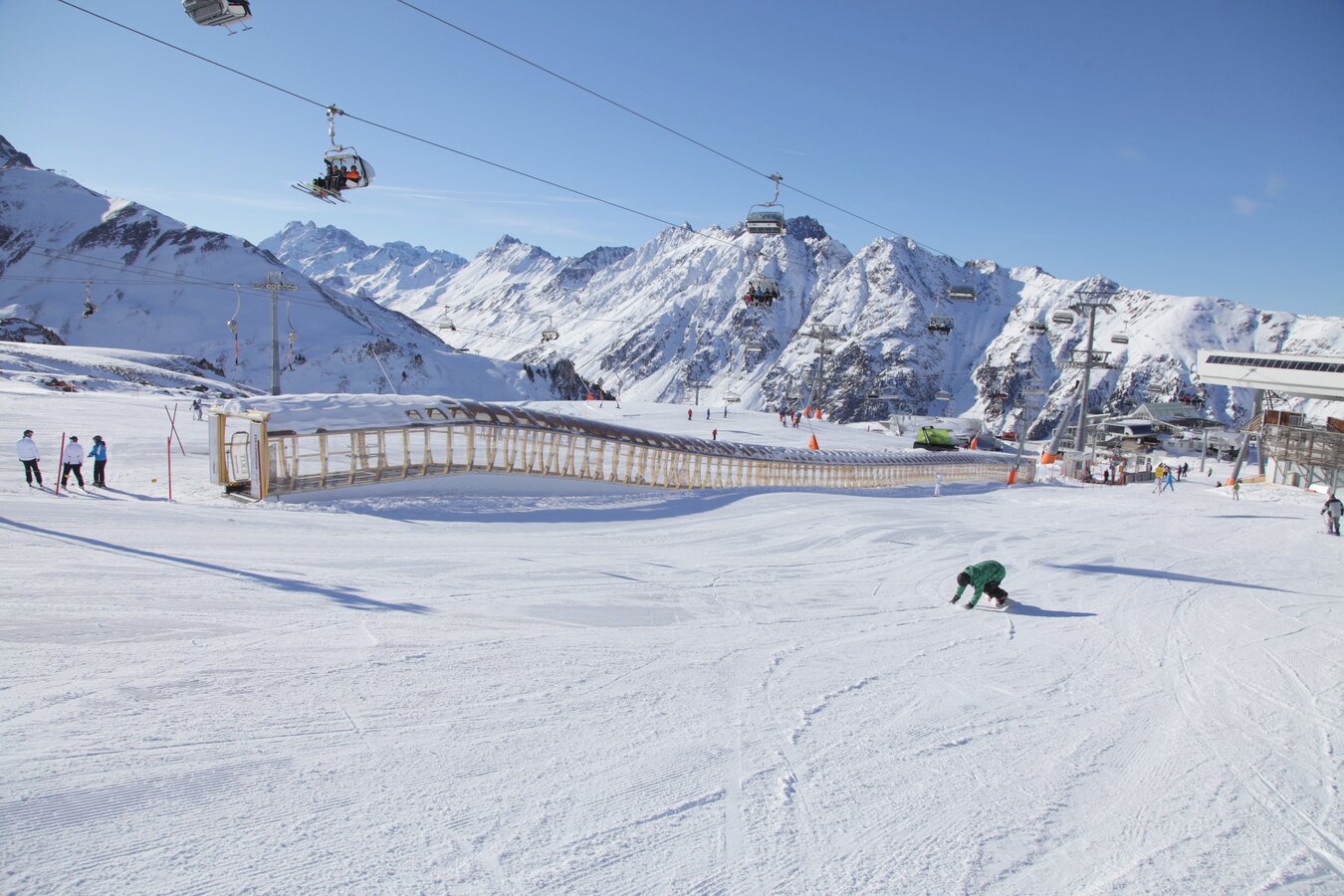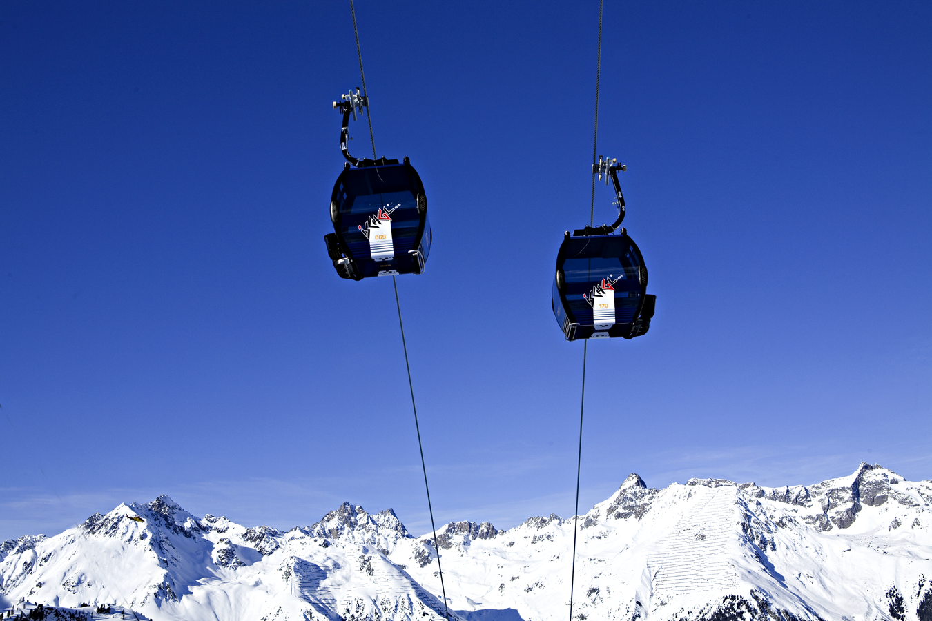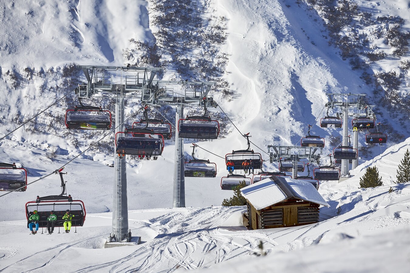 Its 24-passenger bicable ropeway design (funitel system) facilitates safe operation even at wind speeds of 100 km/h. 63 gondolas run from Ischgl to Idalp with a maximum line speed of up to 6 m/s.