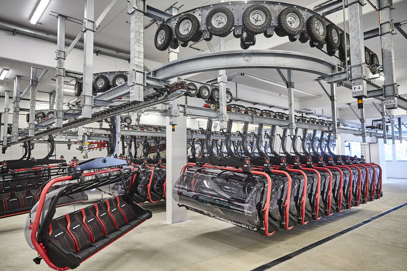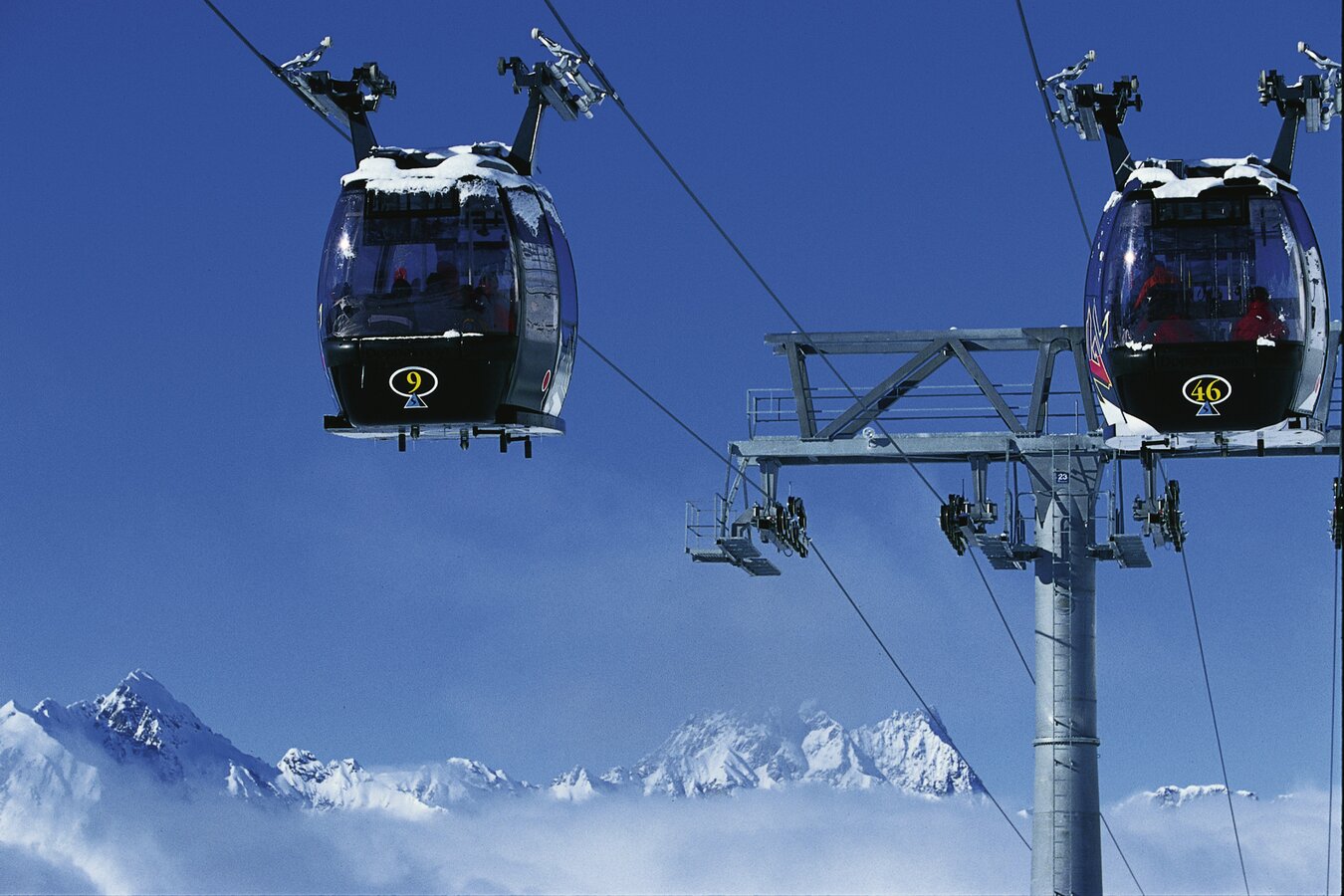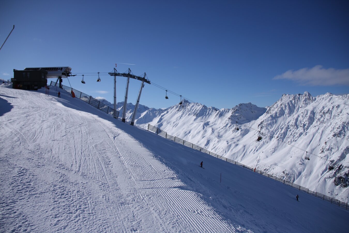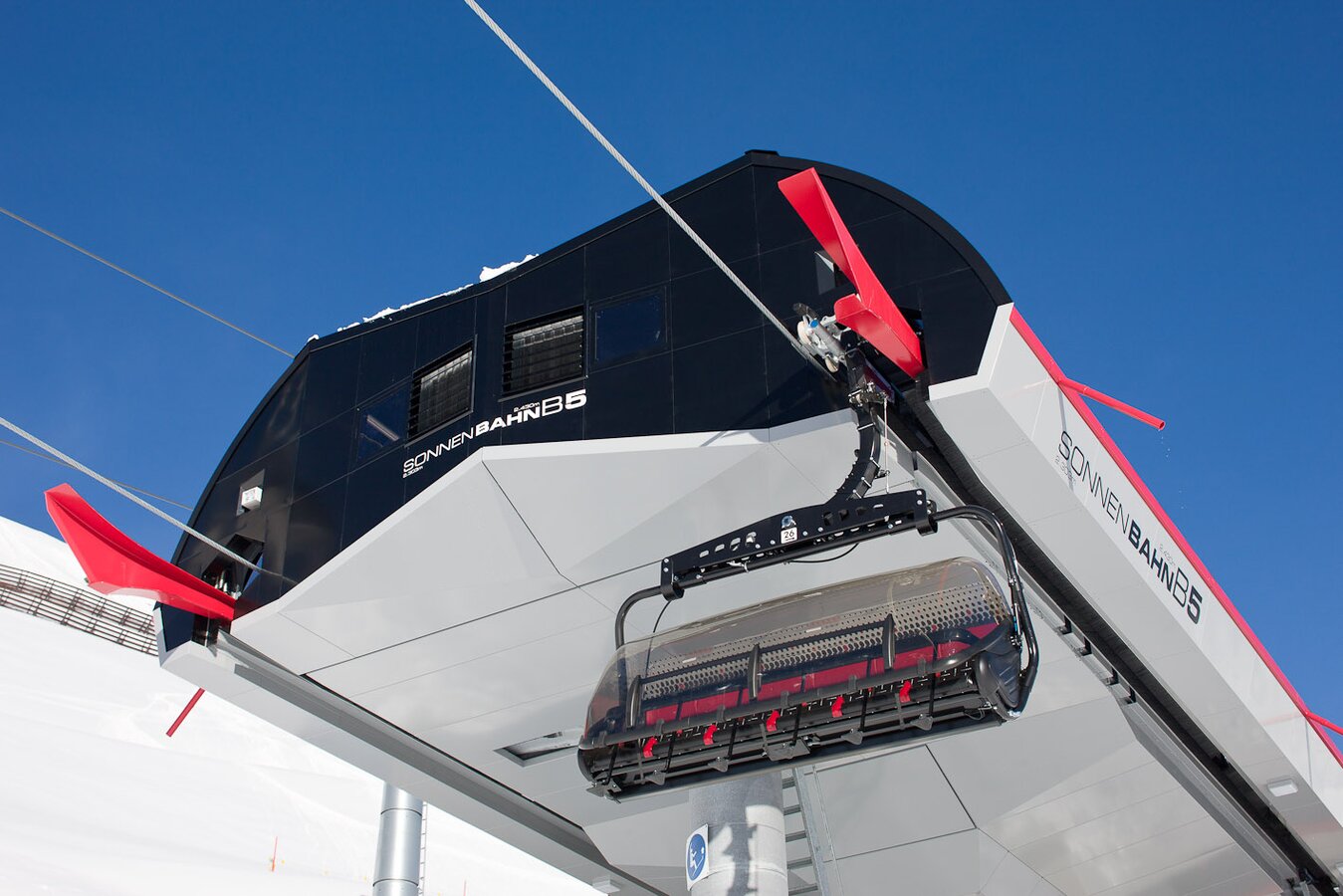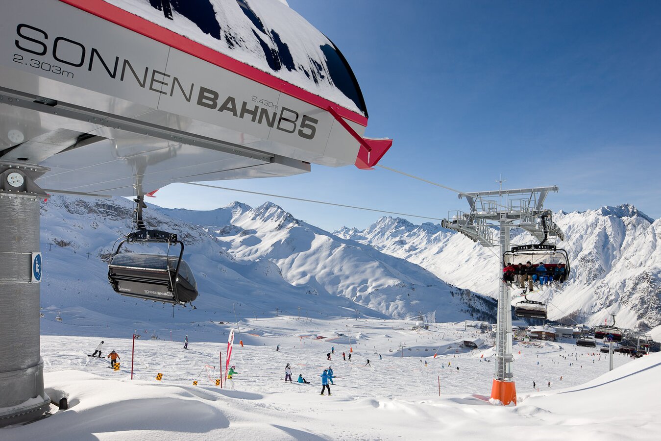 Its 24-passenger bicable ropeway design (funitel system) facilitates safe operation even at wind speeds of 100 km/h. 63 gondolas run from Ischgl to Idalp with a maximum line speed of up to 6 m/s.