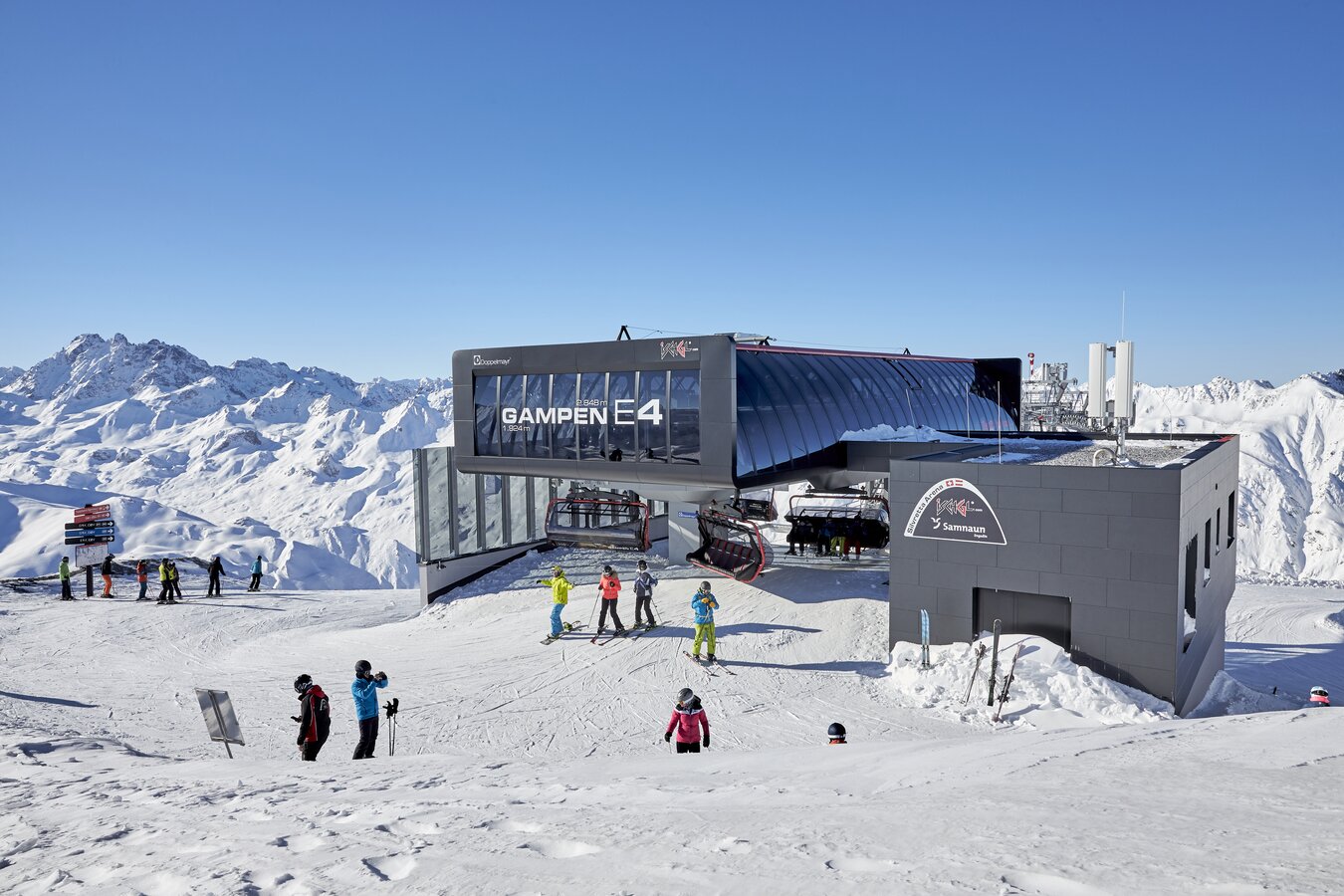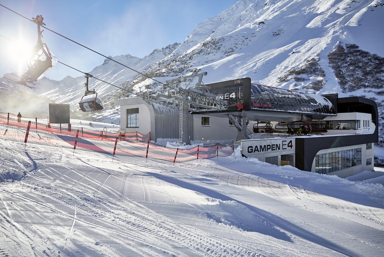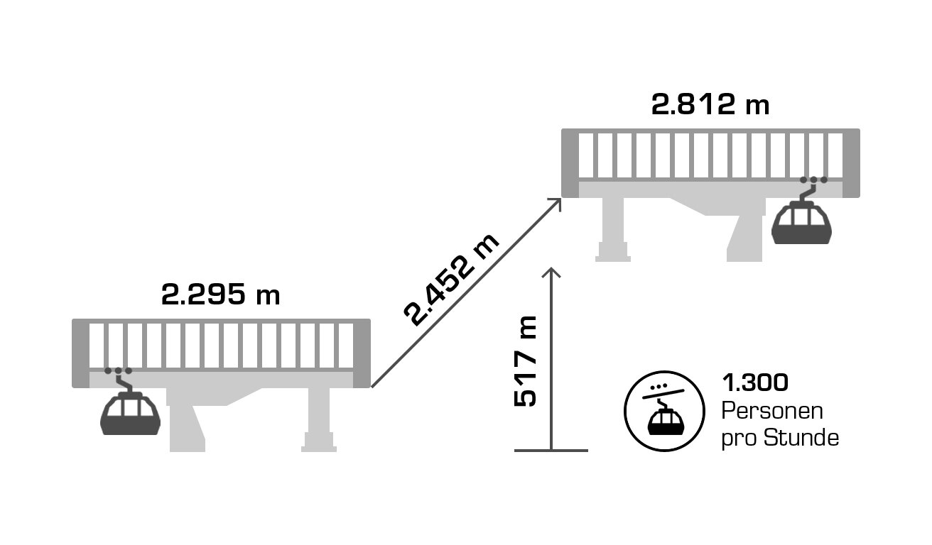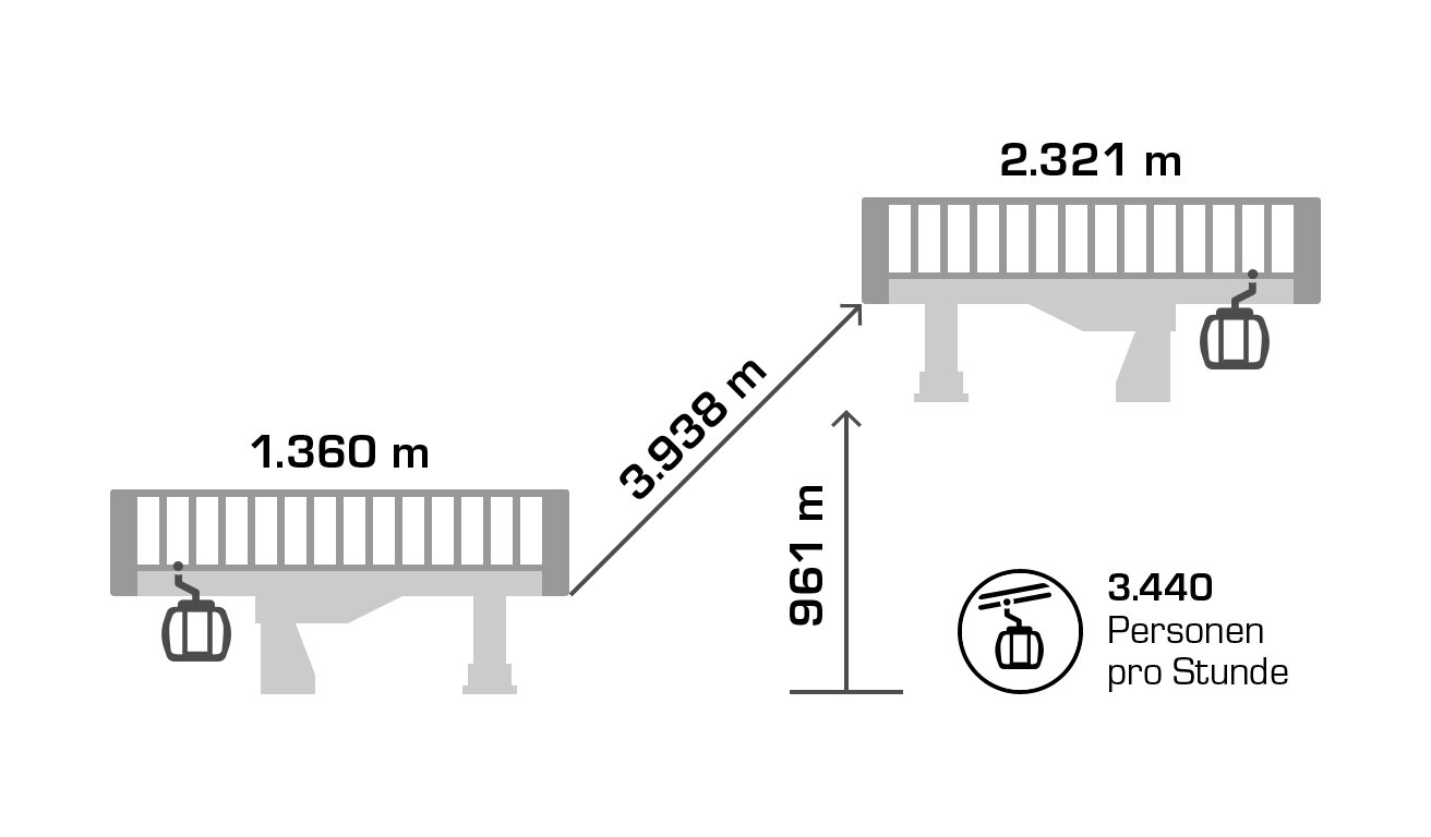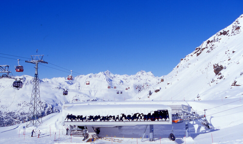 The Silvrettabahn was constructed in summer 1998. It boasts a vertical rise of 961 m, a route distance of 3.938 mand a maximum capacity of up to 3.440 persons/hour. The middle station is located at 1.683 m above sea level. 1,4 Mio. guests per winter season use the facility.