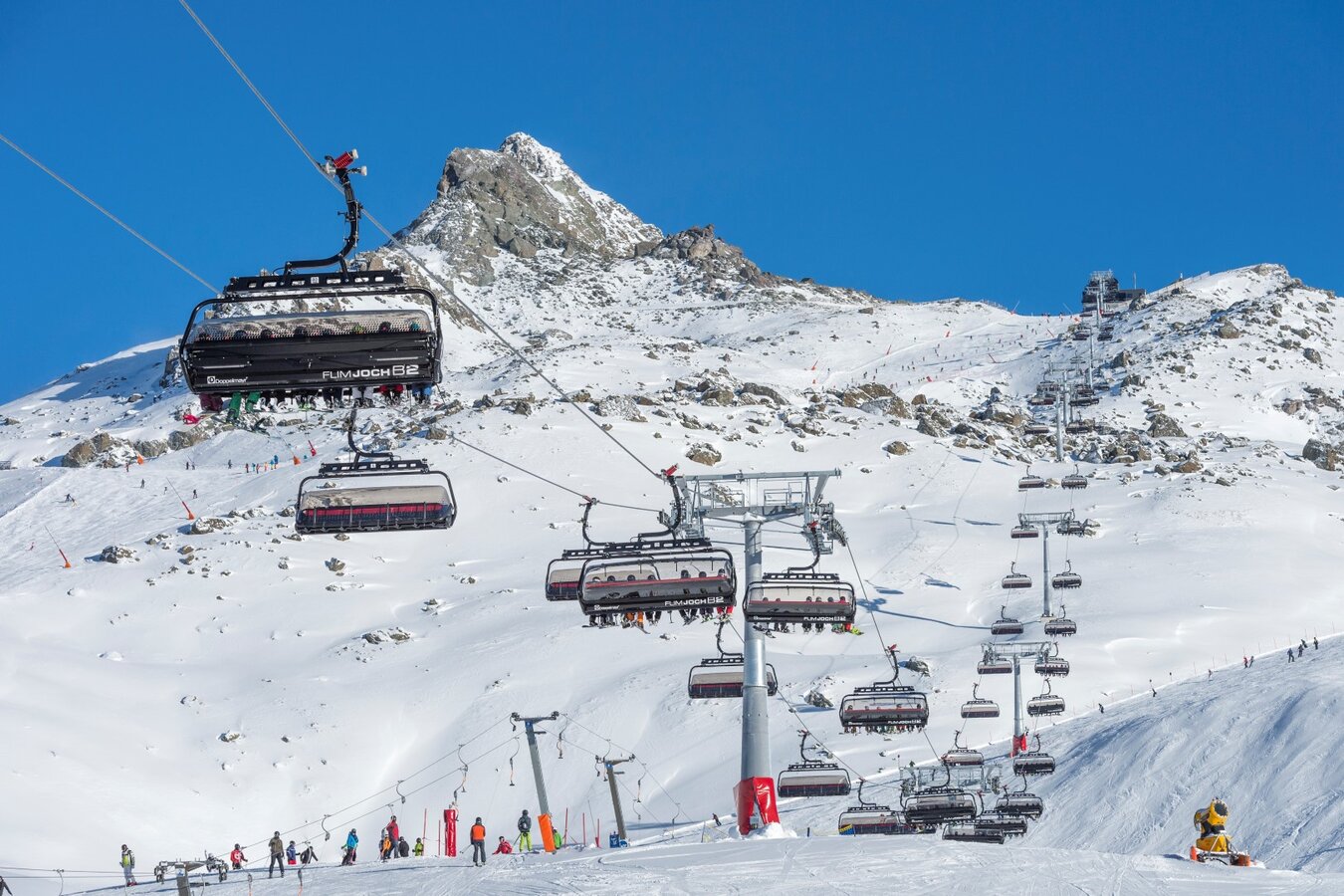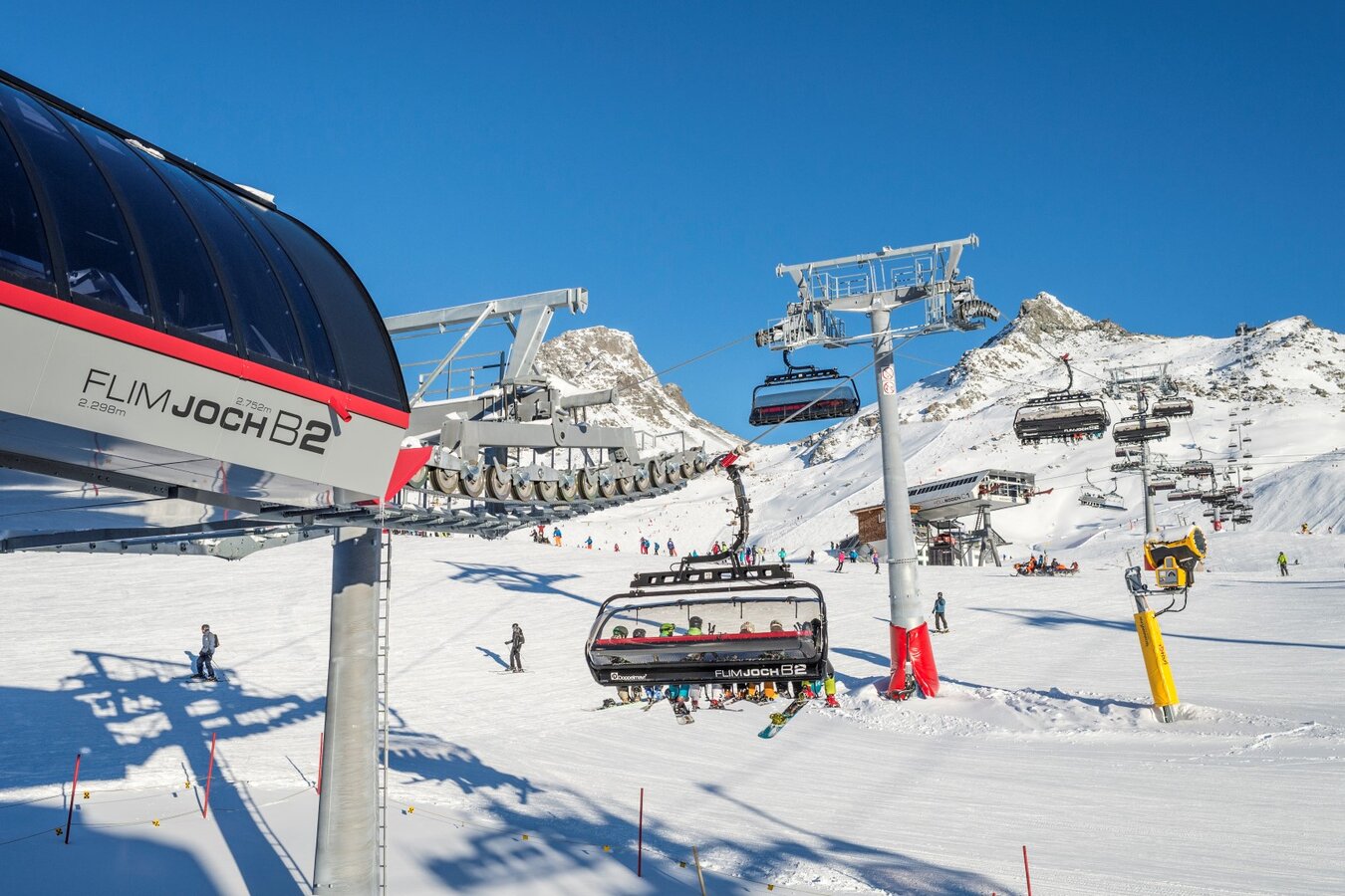 The detachable chair lift departs at 2,302 m above sea level (Idalp) and runs over 16 pillars to the Viderjoch, located at 2,756 m altitude. In winter, this facility is mainly used to support the Idjoch 8-person chair lift. The 87 chairs are equipped with comfortable seat covers, seat heating and weather protection bubbles. The facility has a total capacity of 3,200 m persons per hour. The Flimjochbahn operates from the mountain station, has a vertical rise of 454 m and a route distance of 1,797 m. Built in 2016, this lift facility boasts an average of 1,2 Mio. trips per winter. season. Bike transport capacity: 120 bikes per hour