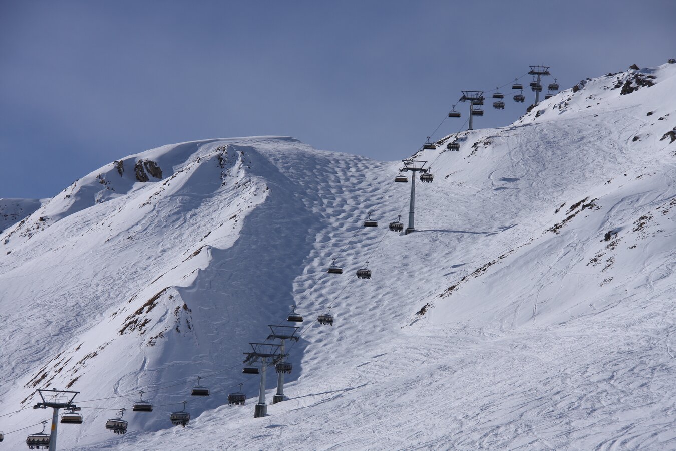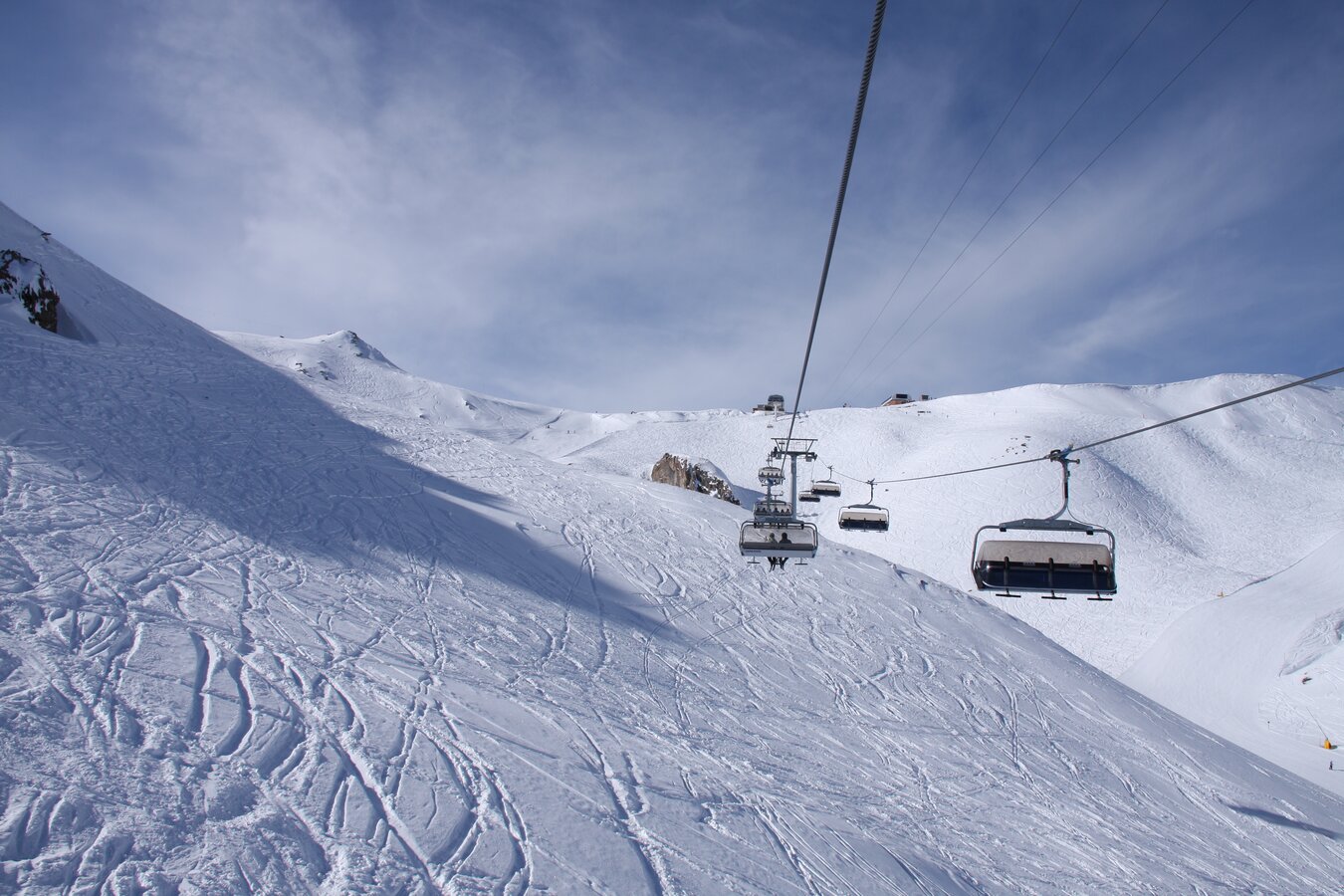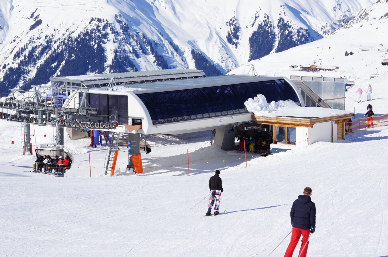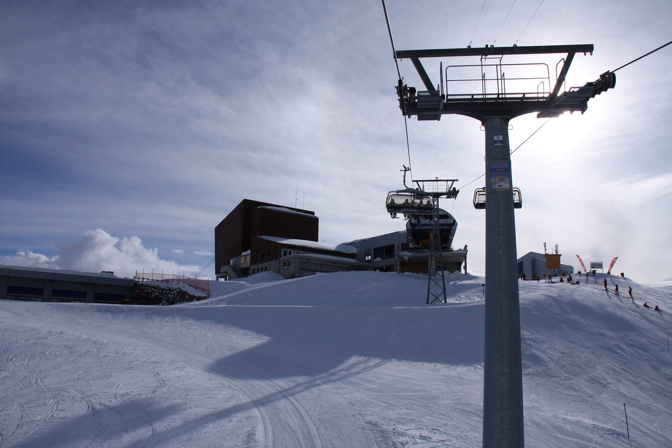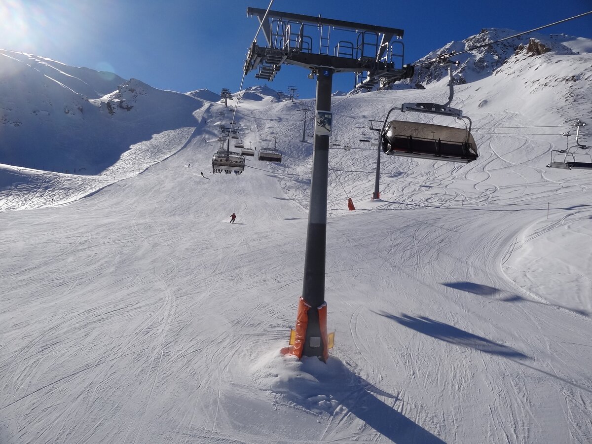 The Flimsattelbahn has a vertical rise of 490 m and a route distance of 2.727 m. It departs from the base station (2.265 m) and runs over 29 pillars up to an altitude of 2.755 m. The 186 chairs are equipped with weather protection bubbles. Constructed in 1994, this facility has a total capacity of 2.400 passengers/hour. 1,1 Mio. guests per winter season use this facility mainly on their way back to Idalp from Alp Trida. The rope has a diameter of 45mm.