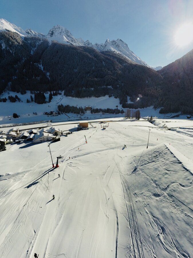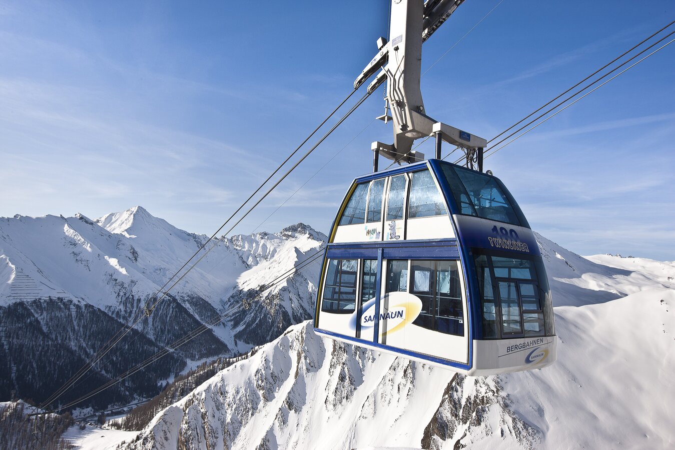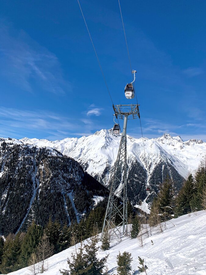 The Twinliner in Samnaun is one of the largest aerial cable cars in the Alps, featuring two double-decker gondolas with a total capacity of 180 passengers, with 110 passengers traveling in the upper and 70 passengers traveling in the lower gondola. The cableway runs with a max. ground clearance of 210 m over 3 pillars from Samnaun to Alp Trider Sattel. Built in 1995, the aerial cableway has a vertical rise of 722 m, a route distance of 2.300 m and a total capacity of 1.620 persons/hour. Maximum speed is 10 m/s, rope diameter is 64mm.
