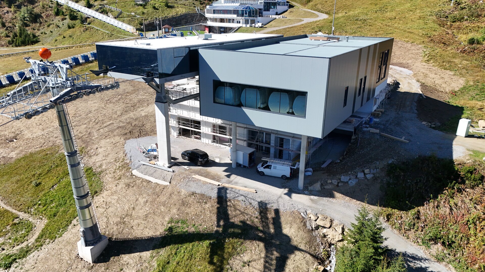 Die Gondeln sind im Gondelbahnhof der Bergstation eingelagert. Auf dem Bild ist eine der ausgepackten Gondeln gut zu erkennen. Sie präsentiert sich im schlichten, eleganten Design, das speziell für die neue Anlage entwickelt wurde. Ebenfalls sichtbar: die bereits vollständig montierten Fassadenelemente der Bergstation – ein weiterer Meilenstein auf dem Weg zur Fertigstellung.
